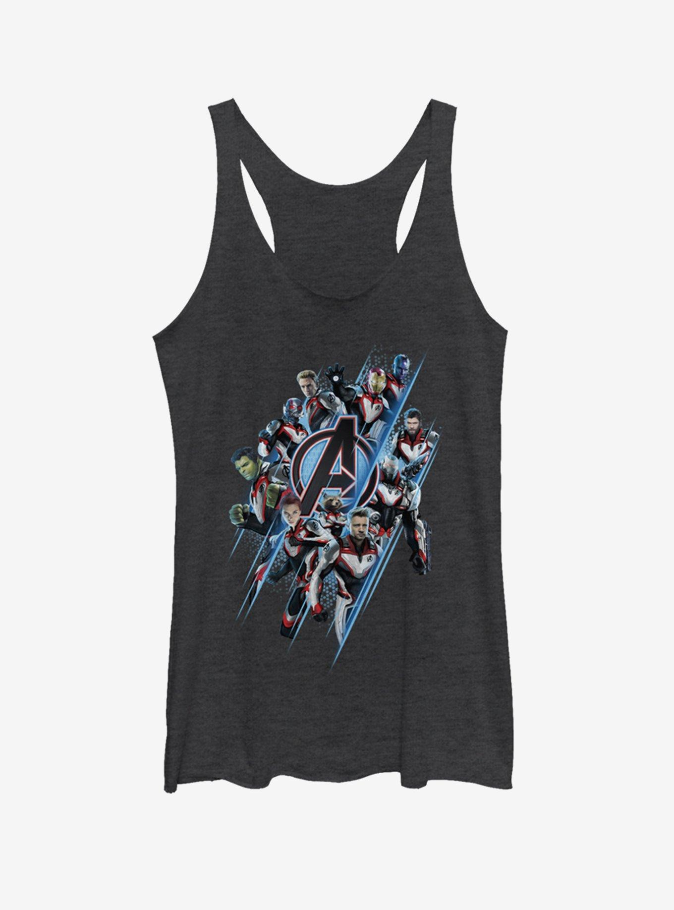 Superheroes need super suits. You, however, just need a cool looking top. This heathered black tank features the Avengers screened around their iconic A logo.