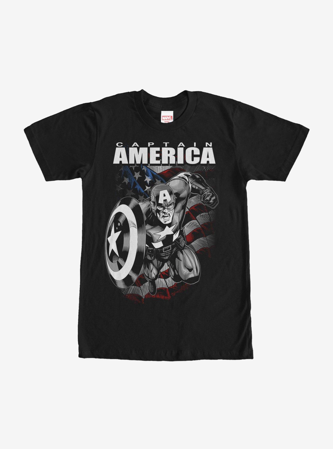 During the most difficult times, America calls on the greatest patriot with the Marvel Captain America Patriot Black T-Shirt. This awesome black Captain America shirt features the patriot, Steve Rogers, in grayscale with the American flag behind him. 100% Cotton.