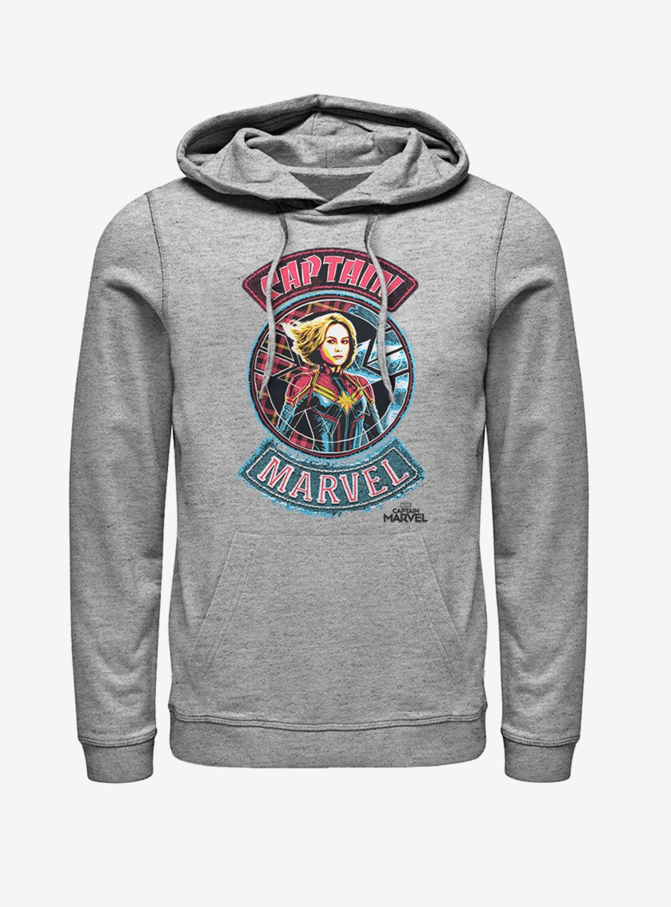 Faux patches are screened on the front of this heathered hoodie. Why? 'Cause patches are awesome - and so is Captain Marvel. That's why.