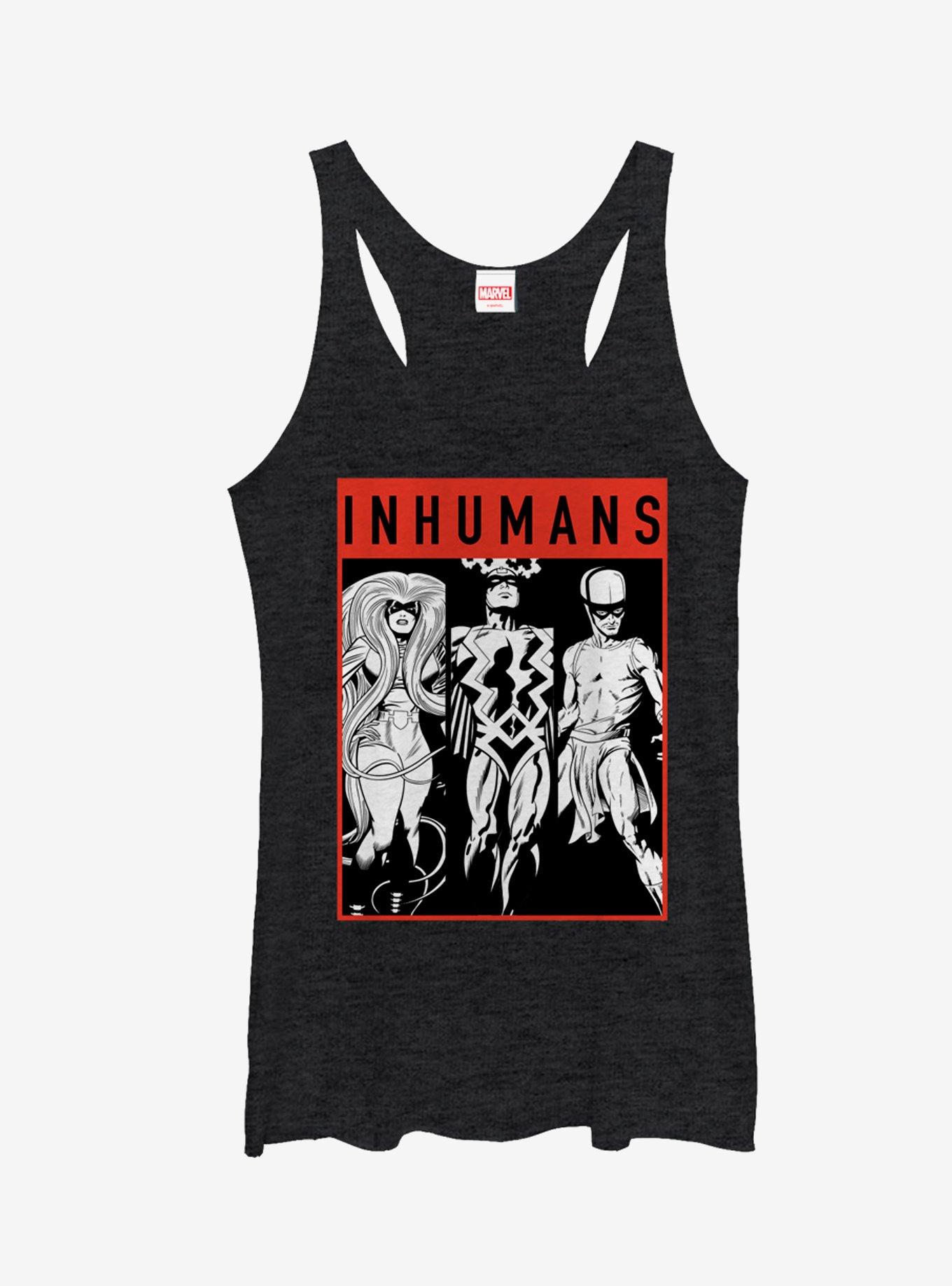 Rise up and help defeat Ronan with the Marvel Inhumans Grayscale Heather Black Racerback Tank Top! This soft and breathable black Marvel tank top portrays King Black Bolt, Queen Medusa, and Karnak in black and white print bordered by a thin red frame. 50% Polyester, 25% Cotton, 25% Rayon.