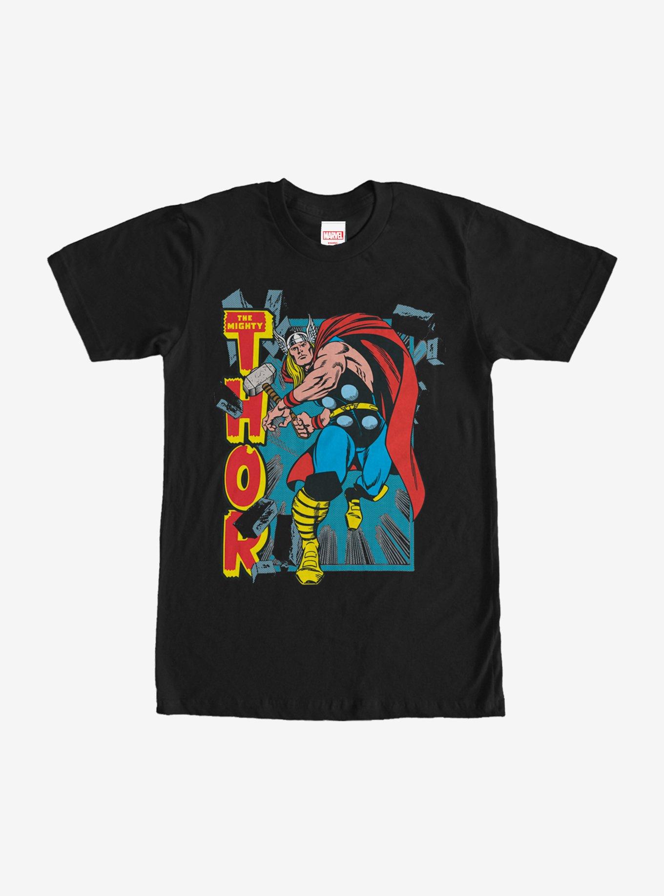 No one will accuse Thor of being a bore with the Marvel Mighty Thor Rock Black T-Shirt. This durable black shirt has a vintage feel with the comic book-style Thor smashing through a stone wall with his trusty hammer printed alongside the classic Mighty Thor logo in red and yellow. 100% Cotton.