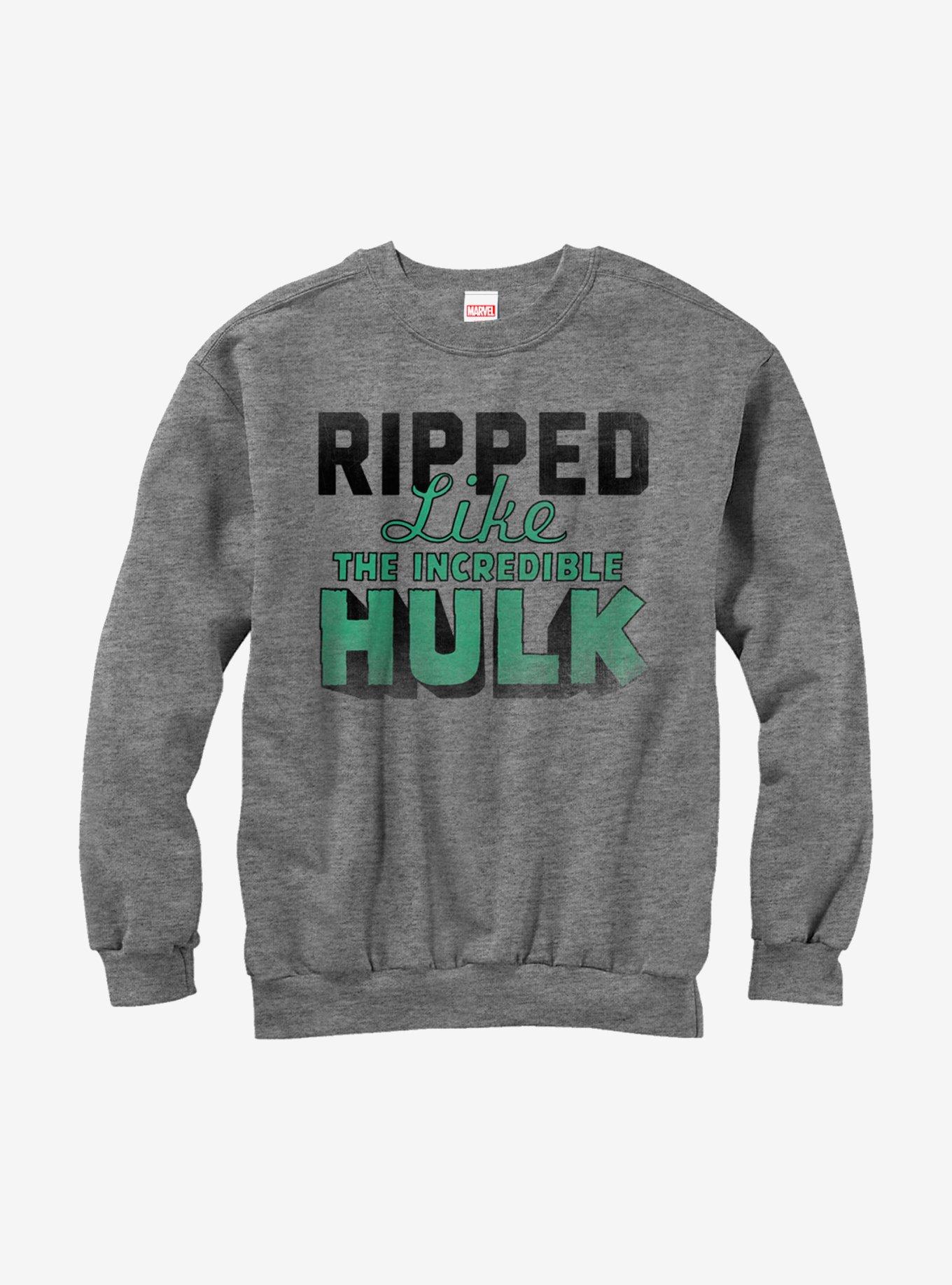 It's time to hulk up and bulk up with the Marvel Hulk Getting Ripped Oversized Heather Gray Sweatshirt! This cute gray boyfriend-cut Hulk sweatshirt features "Ripped Like the Incredible Hulk" in a distressed black and green text. 50% Cotton, 50% Polyester.