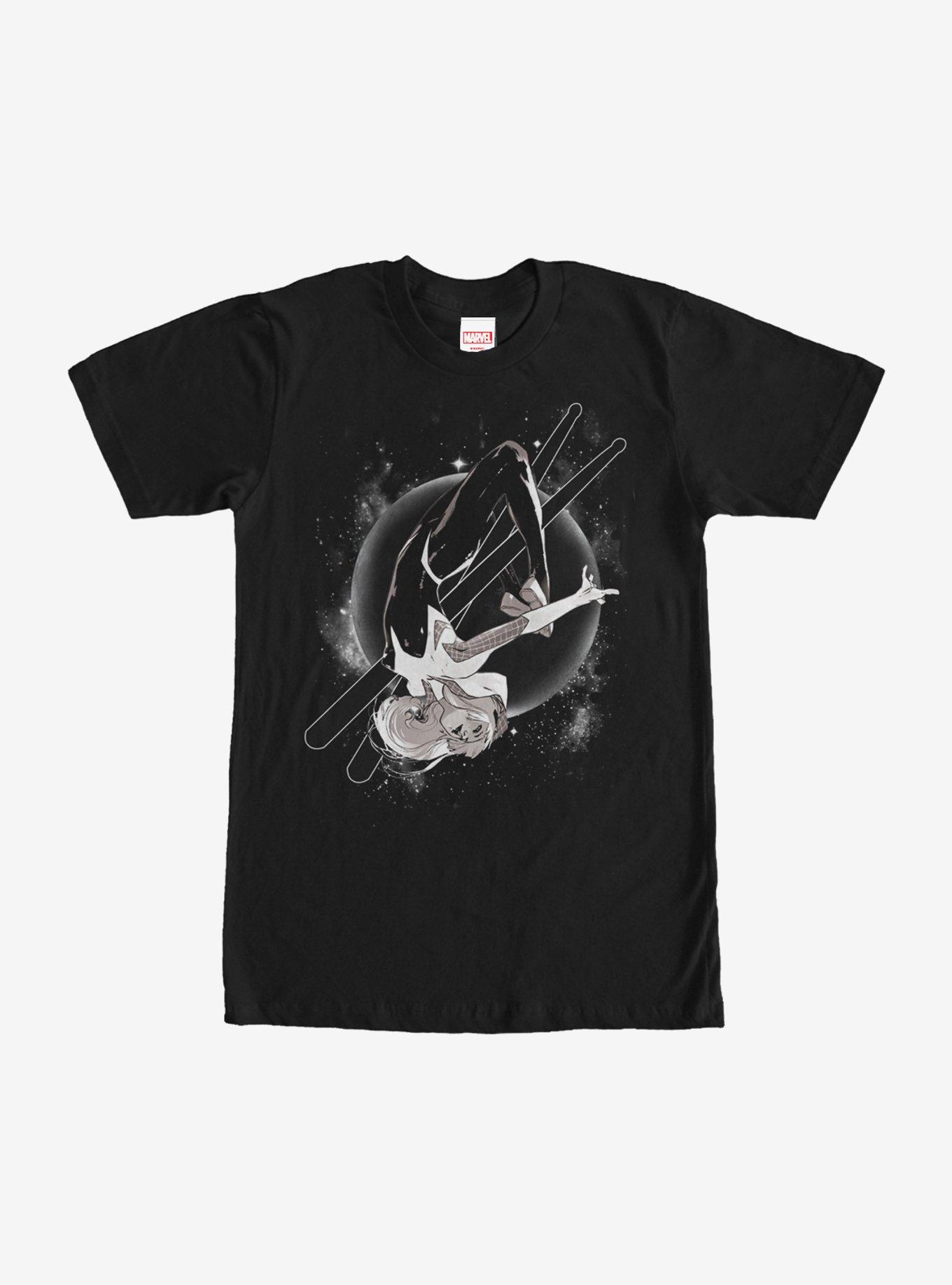 Ghost-Spider loves this tee to the moon and back! Gwen Stacy, or Ghost-Spider from the alternate reality designated Earth-65, is featured with a starry sky behind her on this black tee.