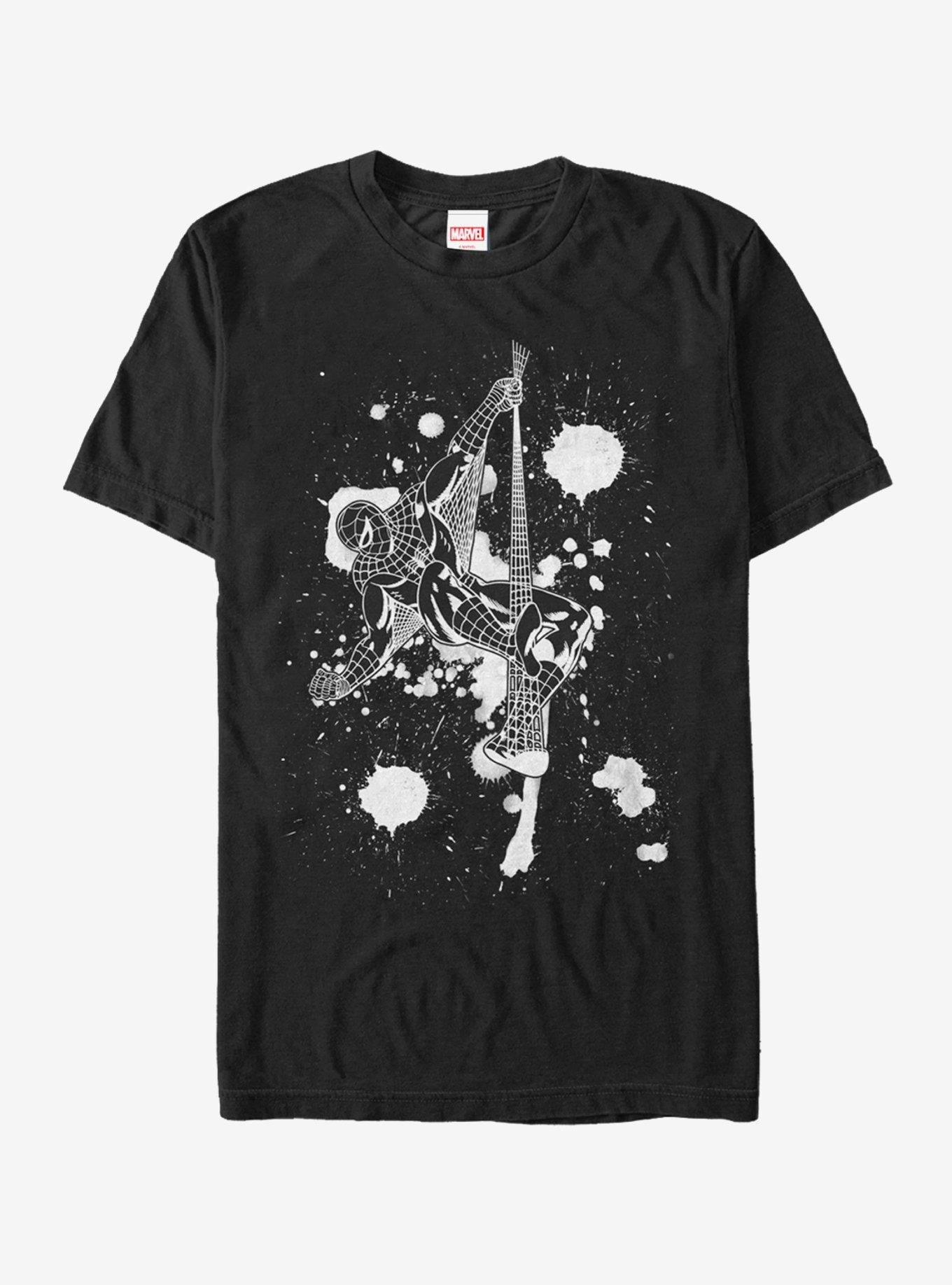 Pay tribute to Peter Parker with the Marvel Spider-Man Paint Splatter Art Black T-Shirt! A distressed white print on the front of this unique men's Spider-Man shirt features webs, paint-style splotches, and of course, Spider-Man himself. 100% Cotton.