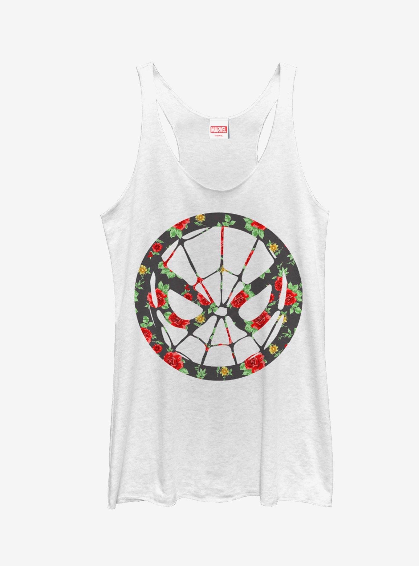 Spidey gets in touch with his "spider" core by spending some time with nature on the Marvel Spider-Man Rose Print Heather White Racerback Tank Top. Spider-Man's iconic mask is filled with a rose floral pattern in red, yellow, and green print down this light gray Spider-Man tank top. 50% Polyester, 25% Cotton, 25% Rayon. Designed with raw-edge hems.
