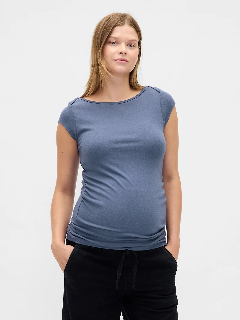 Soft, stretch cotton-modal blend maternity top. Boatneck with lap shoulders. Short cap sleeves. Ruching at sides. Please note: Maternity styles cannot be returned in store. Please enjoy free returns by mail. This product was made in a factory that invests in gender equity and women’s empowerment through RISE. Learn more at gapinc. com/equity.