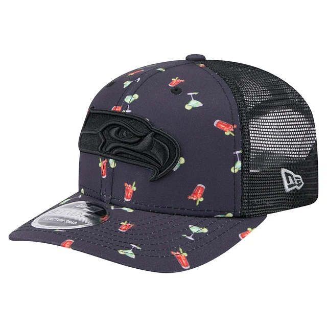 Men's New Era Navy/Black Seattle Seahawks Adventure Drinks Pattern 9SEVENTY Stretch-Snap Hat