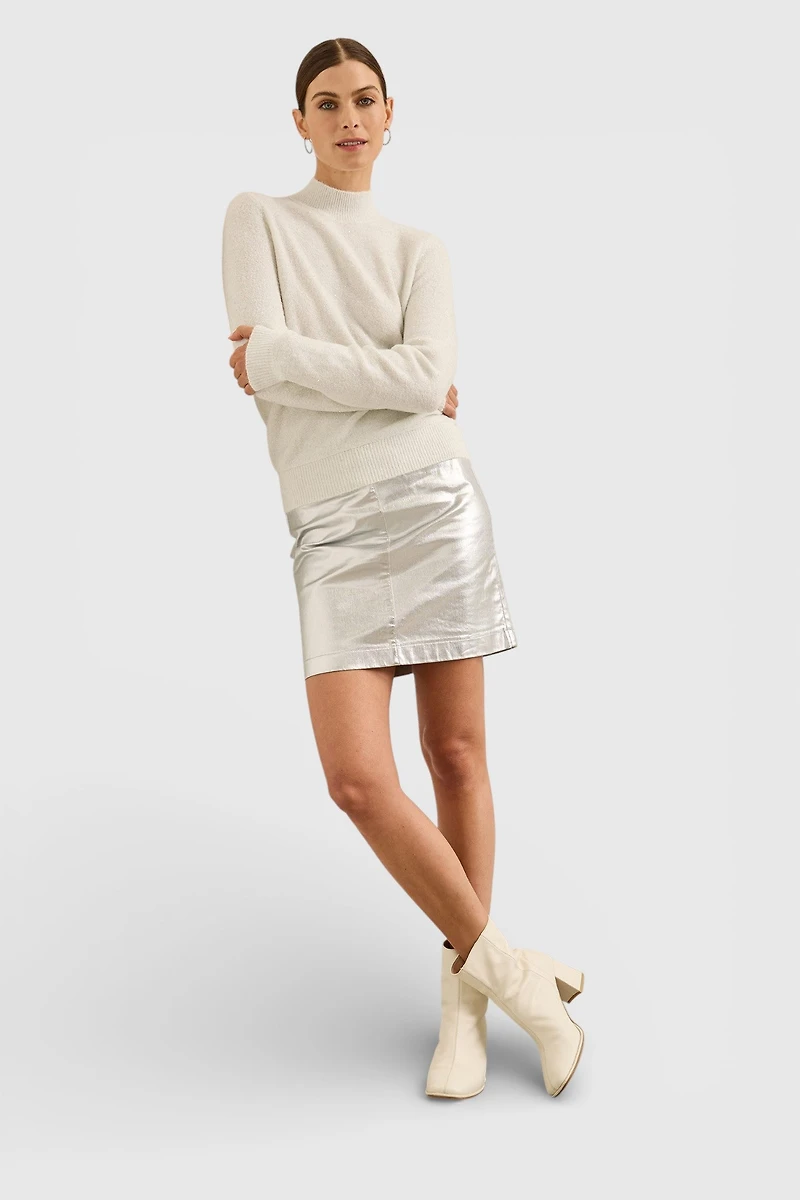 Shine bright in this Metallic Coated Skirt, designed to bring a bold, modern edge to your wardrobe. With its sleek finish and flattering straight cut, it’s perfect for styling day to night. The cotton-rich fabric with added stretch ensures comfort while keeping its structured look. Wear it with a knit sweater and ankle boots for a trendy, balanced outfit.