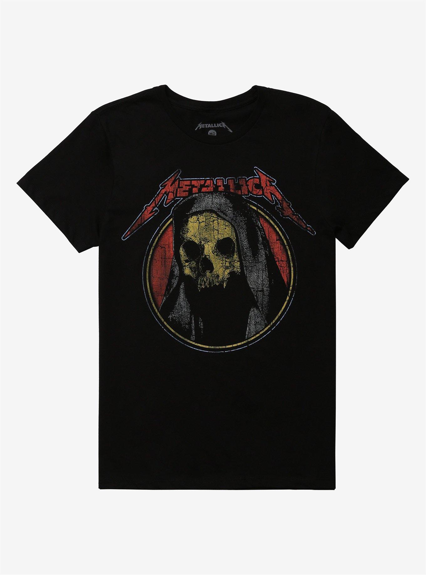 A Metallica T-shirt to help you shred. A distressed red, yellow and black grim reaper logo appears on the front below the Metallica logo.