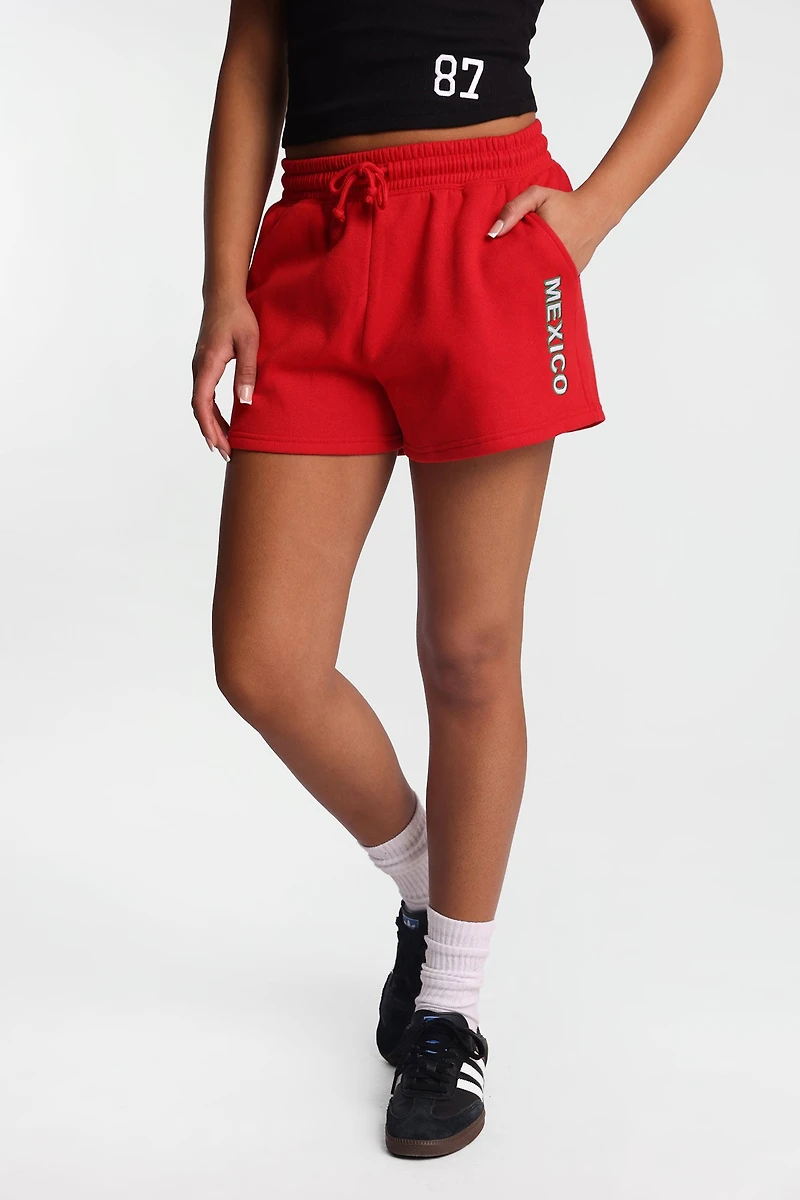 Knit. Fleece shorts. With a mid-rise, an elastic waistband, and a super relaxed fit. Embroidered graphic on thigh. Part of The World's Game capsule collection. Details• Knit fleece• Shorts• The World's Game capsule collection• Available in a solid colour• Team Mexico embroidered flag patch graphic on bottom seam• 2 side pockets• Elastic waistband• Drawstring waist• Imported• Style: 1196-2619 Fit• Mid-rise• Slouchy shorts• Approx. inseam: 3", Rise: 12 3/4"• Model height: 5'8", wears a size: S/P Care & Materials• 78% Polyester, 22% Cotton• Machine wash in cold water. Gentle cycle with like colours. Turn garment inside out while washing. No bleach. Tumble dry low. Low iron.