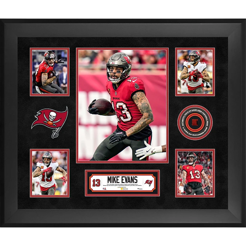 Show your Tampa Bay Buccaneers pride with this Mike Evans Framed 20" x 24" 5-Photo Collage. It features five action-packed photos of the star wide receiver, along with a piece of game-used football, making it a truly unique collectible. This limited-edition collage is individually numbered out of 500 and authenticated with FanSecure technology to make it the perfect way to celebrate Mike Evans's impact on the Tampa Bay Buccaneers.