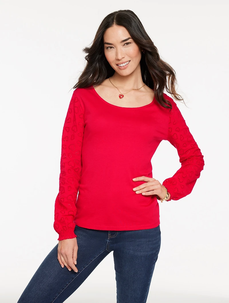 Sweet tiny hearts pattern the sheer sleeves of this fabulous top. Beautifully detailed with elastic sleeves cuffs. Perfect for your casual-chic wardrobe.