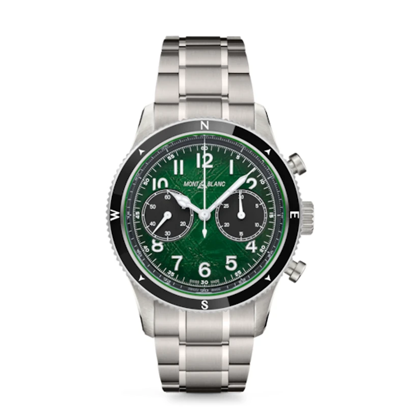 Capturing the spirit of mountain exploration and the beauty of Antarctica’s glacial landscape, the sfumato green glacier pattern dial of this Montblanc 1858 Automatic Chronograph 0 Oxygen is inspired by the deep green colour of the emerald icebergs or “jade bergs”. The timepiece is housed in a 42 mm stainless steel case totally devoid of oxygen. The dial is adorned with a bi-compax chronograph configuration with a black small seconds display at 9 o’clock and a black 30-minute chronograph counter at 3 o’clock. Matching the sub dials, this timepiece comes with a black bi-directional ceramic bezel with luminescent cardinal points. It is fitted with an interchangeable stainless steel bracelet with taper and fine adjustment system and an engraved case back featuring the “Spirit of Exploration” special engraving.