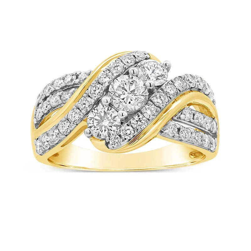 Turn heads with the bold brilliance of the New Brilliance Lab Grown Diamond Fashion Ring. Crafted in warm 10K yellow gold, this luxurious piece features 1.45 carats total weight of lab grown diamonds in a dazzling, multidimensional design. At the centre, three larger round-cut diamonds take the spotlight, surrounded by gracefully curved rows of smaller diamonds that intertwine in a flowing, wave-like pattern. The intricate setting enhances the ring’s sparkle and adds a sense of movement and elegance, making it a standout piece for any occasion.