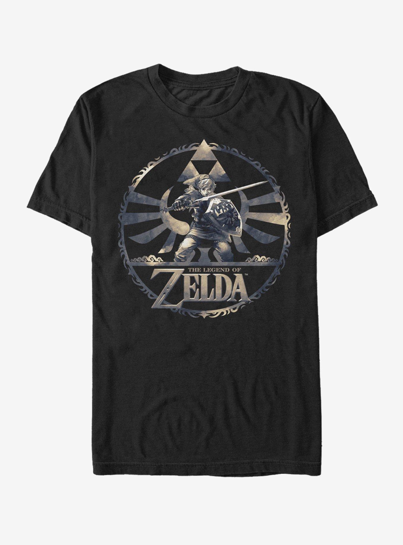 Head to the merchant's store with Link to get the Nintendo Legend of Zelda Link Circle Pattern black T-shirt! An ornate circle pattern portrays Link with his sword and shield, with the Triforce resting proudly above the Hylian Crest.