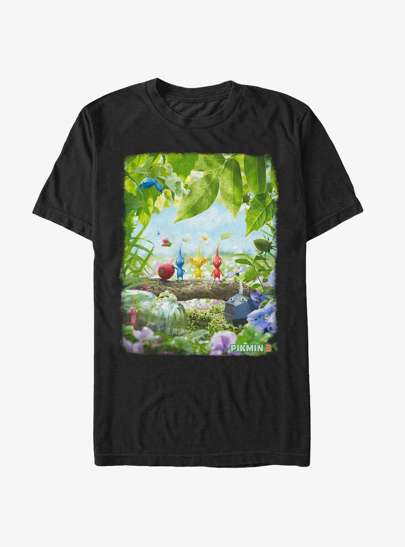 Help Alph, Brittany, and Charlie find fruit and save Koppai with the Nintendo Pikmin 3 Black T-Shirt! A lush scene front planet PNF-404 is printed on the front of this black Pikmin shirt featuring blue, yellow, red, rock, and winged Pikmin. 100% Cotton.