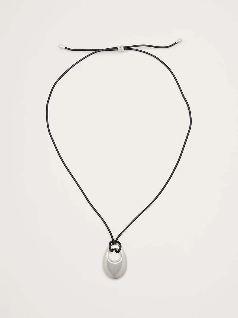 A sculptural silver ring suspended from a simple, leather cord, finished in 999-silver plated brass. 14k-gold or 999-silver plated brass. Leather cord. Adjustable slider closure.