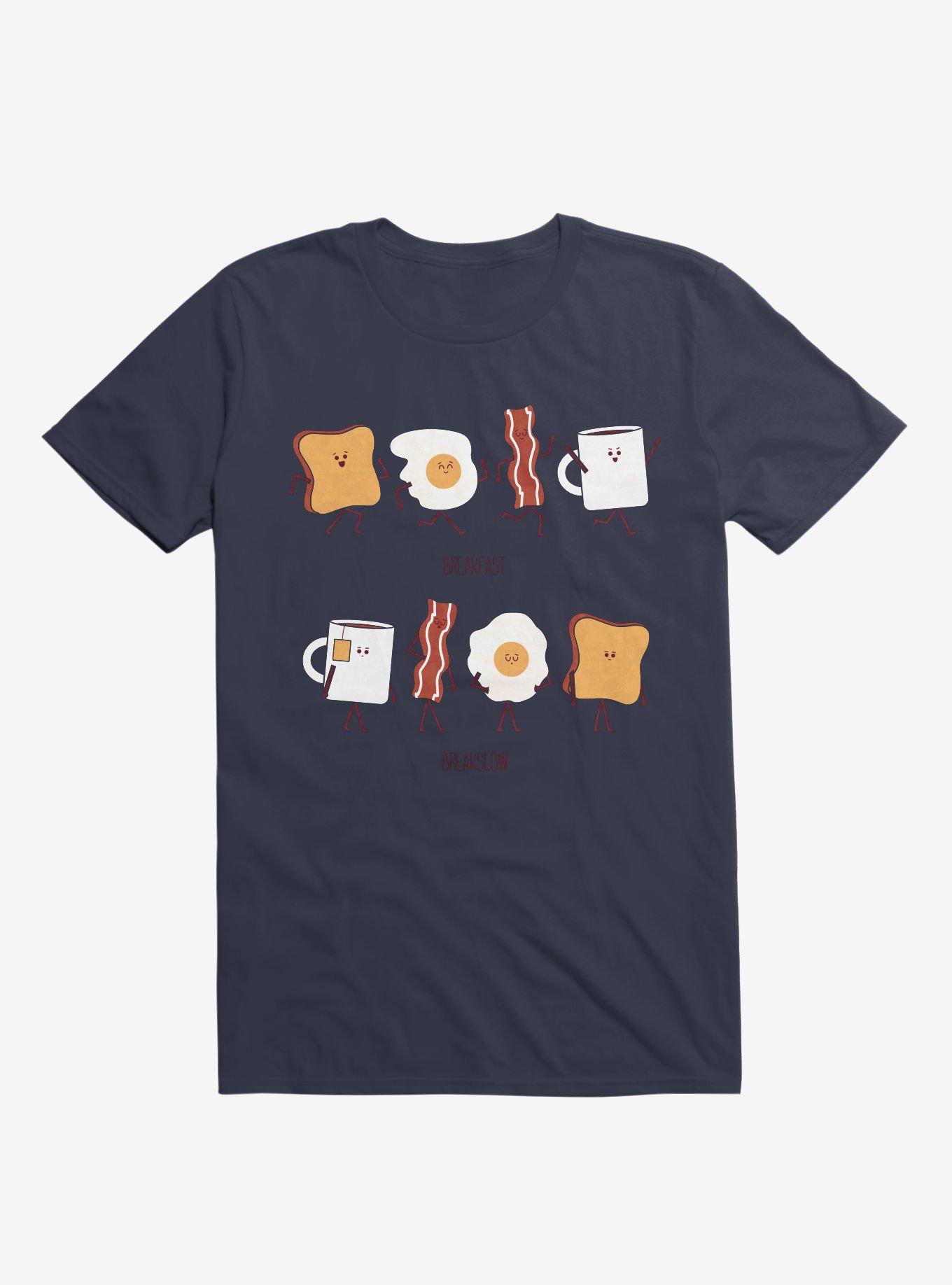 This lightweight navy blue tee poses one very important question: Break fast or break slow ? A piece of toast, an egg, a slice of bacon, and a cup of coffee are in an awful hurry in the graphic up top; in the other... not so much. Officially licensed art from handsoffmydinosaur.
