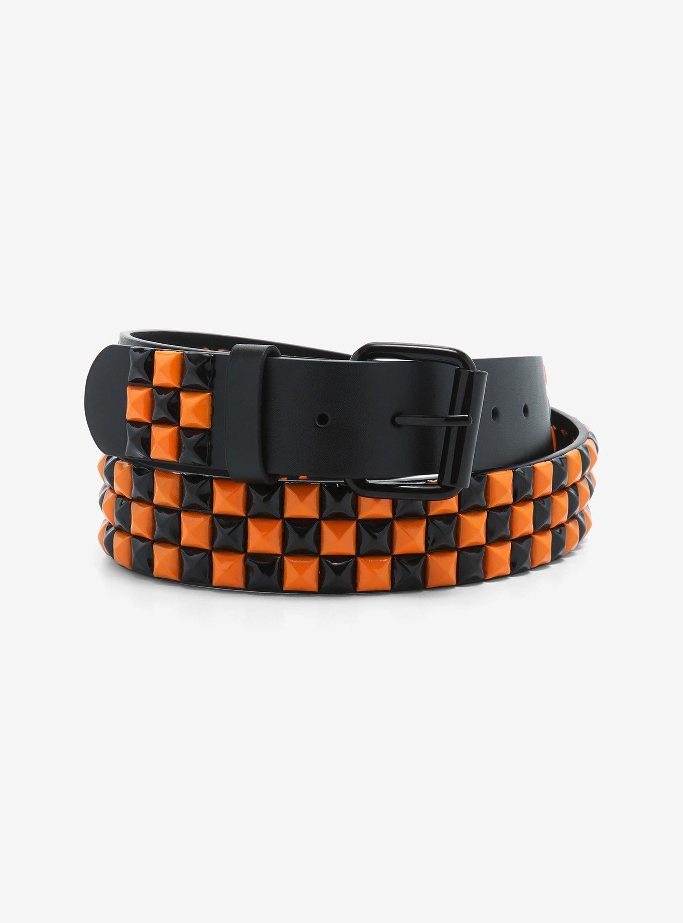 In honor of Halloween, retire the black and white checkered belt... in exchange for a black and orange checkered belt! Belt features three rows of black and orange pyramid studs in a checkered pattern.