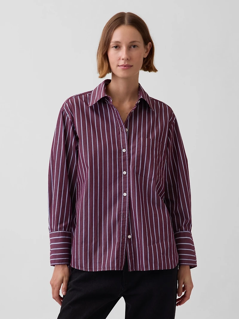 Soft organic cotton poplin oversized shirt. Oversized point collar, button front. Long sleeves with oversized cuffs with button closures. Patch pocket at chest. Allover stripes. Made with 100% organically grown cotton which is grown without the use of synthetic pesticides and fertilizers. This product was made in a factory that invests in gender equity and women’s empowerment through RISE. Learn more at gapinc. com/equity.