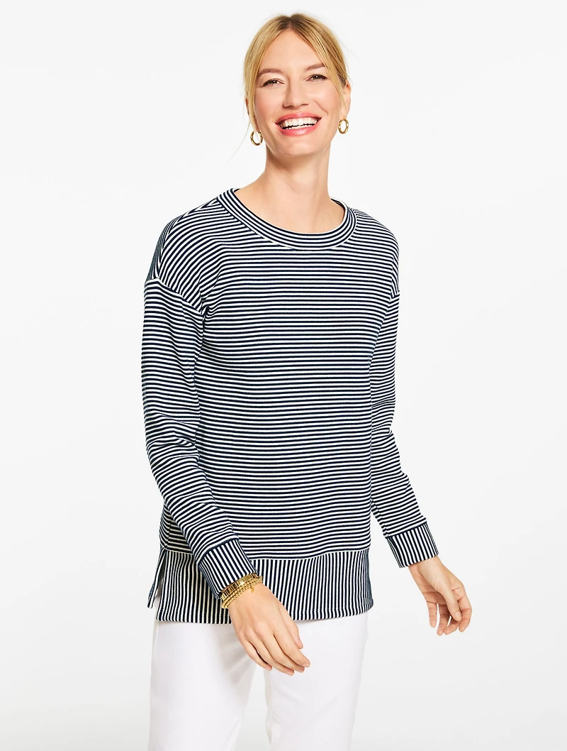 Our wear-with-everything tunic pullover in a vibrant stripe pattern. Crafted from a soft and cozy ottoman knit with side slits at the hem.