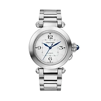 Pasha de Cartier watch, 35 mm, mechanical movement with automatic winding, caliber 1847 MC. Steel case, fluted crown cap and crown set with synthetic spinels, silver flinqué dial, blued-steel diamond-shaped hands, steel bracelet with SmartLink adjustment system, second navy alligator-skin strap, interchangeable steel deployant buckle. Both bracelets are fitted with the QuickSwitch interchangeability system.