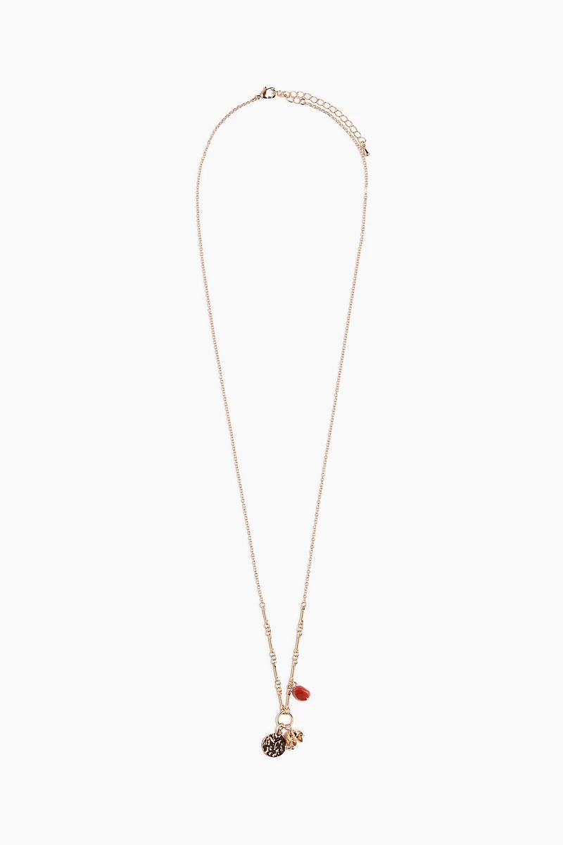 Long chain necklace in metal with pendants in various designs. Adjustable length with trigger clasp.