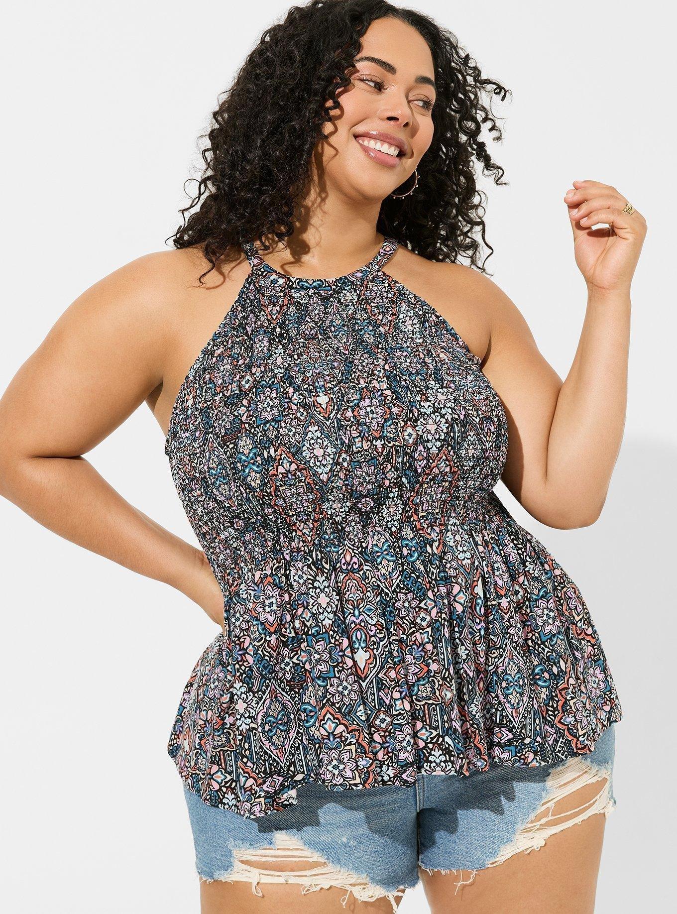 FIT Measures 28"" from shoulder (size 2). MATERIALS + CARE Challis woven fabric: New, improved, and loved by all—and still lightweight, drapey, and (really!) machine-washable. Stretch level: None. 72% viscose, 28% lyocell. Machine wash cold. Tumble dry. Imported. DETAILS High neckline. Sleeveless. Peplum waist. Smocked.