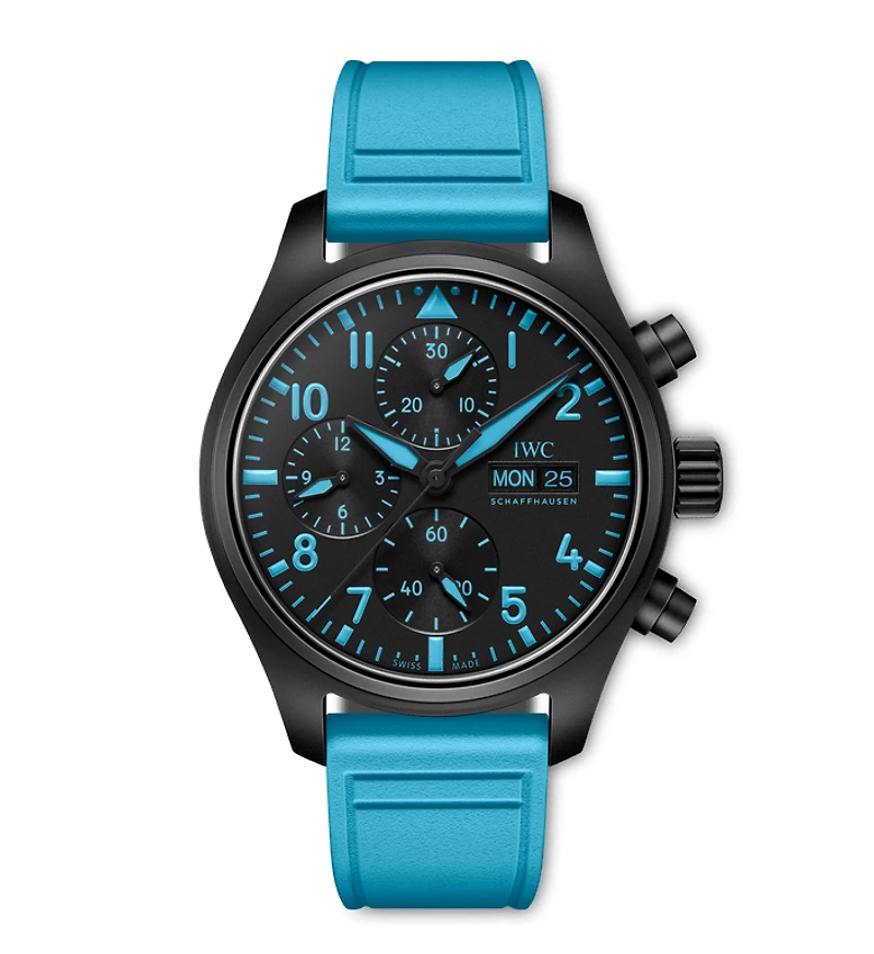 Limited to just 1,063 pieces, the Pilot's Watch Chronograph 41 George Russell in black ceramic brings George Russell's bold motorsport vision to the wrist. The 41.9-millimetre case is crafted from black zirconium oxide ceramic, paired with dial printing and a blue rubber strap in a unique hue inspired by the driver's racing helmet. Powered by the IWC-manufactured calibre 69380, this mechanical chronograph features a classic column-wheel design with a bidirectional pawl winding system delivering a 46-hour power reserve. The vertical subdial layout places the stop minutes at 12 o'clock for instant readability. A day-and-date display sits at 3 o'clock. The soft-iron inner case shields against magnetic fields, while the sapphire glass with dual-sided antireflective coating ensures clarity in all conditions. The EasX-CHANGE system allows effortless strap swaps without tools.