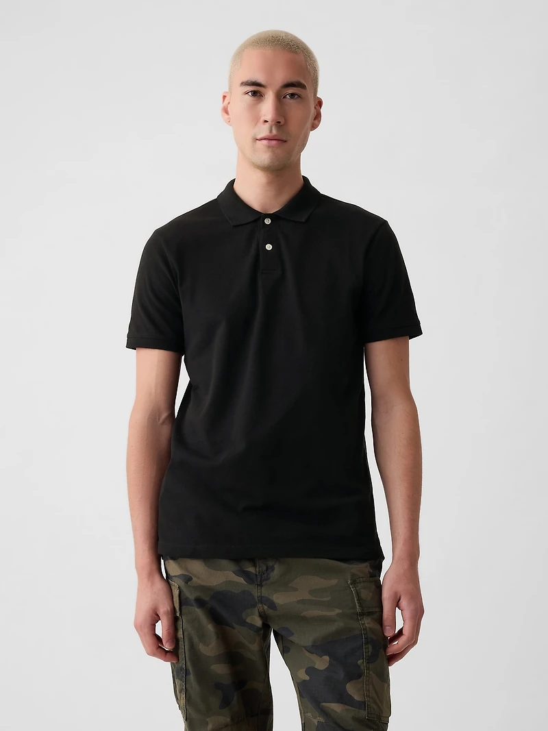 Soft, stretch pique knit with moisture-wicking properties. Short sleeves with flat rib-knit cuffs. Flat rib-knit polo collar. Button placket. Side vents at hem. This product was made in a factory that invests in gender equity and women’s empowerment through RISE. Learn more at gapinc. com/equity. Coton 98% Fibre élasthanne 2%