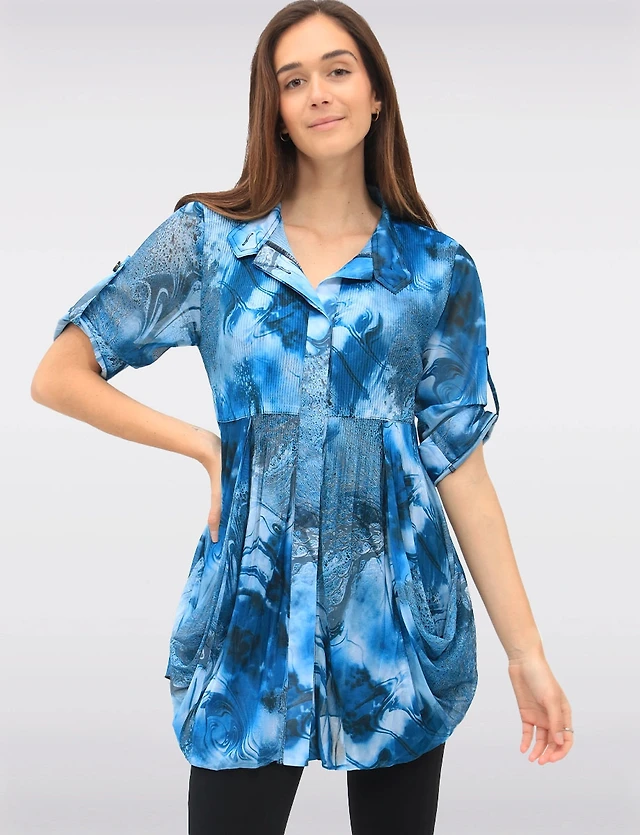 Pleated Button-Down 3/4 Sleeve Tunic With Abstract Floral Print by Lindi