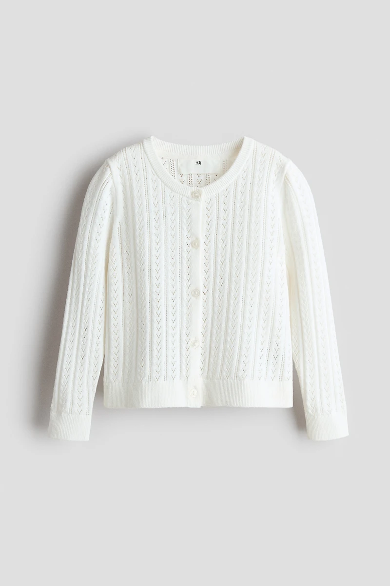 Pointelle-knit cardigan in soft cotton. Round neckline, buttons at front, and ribbing at neckline, cuffs, and hem.