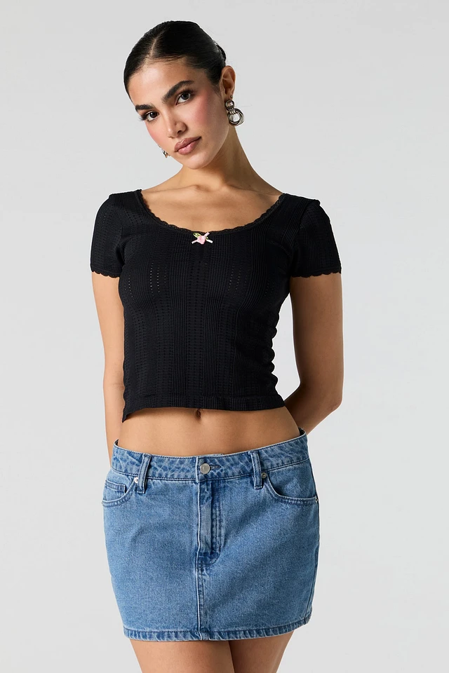 AERO Graphic Off-Shoulder Long Sleeve Lace Trim Top