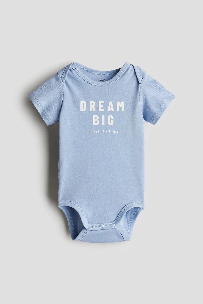 Bodysuit in supersoft cotton jersey with a printed design. Lap shoulders for smooth dressing, short sleeves, and snap fasteners at bottom for easy changing.