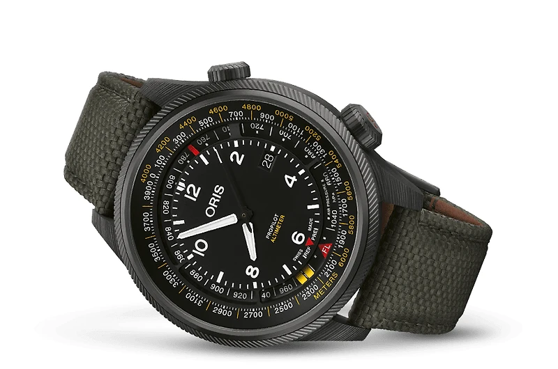 The ProPilot Altimeter is the world's only watch with an automatic mechanical movement and a built-in mechanical altimeter. It can measure altitude up to 6,000 metres. It has a 47 mm carbon fibre case and a fabric strap, and weighs just 98 grammes.