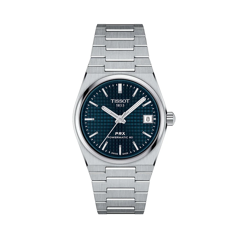 Introducing the Tissot PRX 35mm Powermatic 80, a perfect balance of timeless appeal and modern craftsmanship. This 35mm watch boasts a high-quality steel case and a captivating blue dial, inspired by its renowned 1978 predecessor. The distinctive waffle dial pattern adds an extra layer of elegance to the automatic model. Water-resistant up to 100 meters and featuring a Nivachron™ balance hairspring, the PRX is an ideal choice for style-savvy individuals. The satin-finish steel bracelet with a triple-blade folding steel clasp guarantees all-day comfort. Stand out with the Tissot PRX 35mm Powermatic 80 in blue.