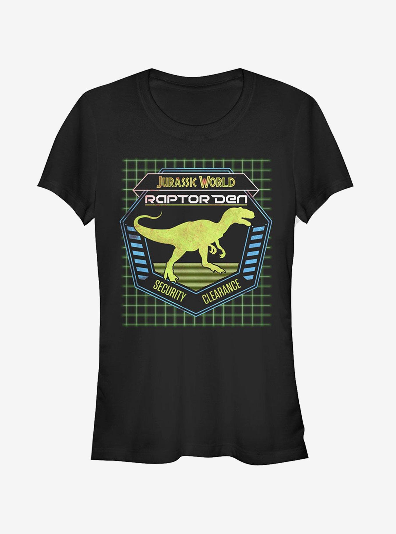 We do not recommend you enter the Raptor Den, but the Jurassic World Raptor Den T-Shirt gets our full approval! This slim fit tee reads "Raptor Den Security Clearance" next to a dinosaur, with the Jurassic World logo at the top.