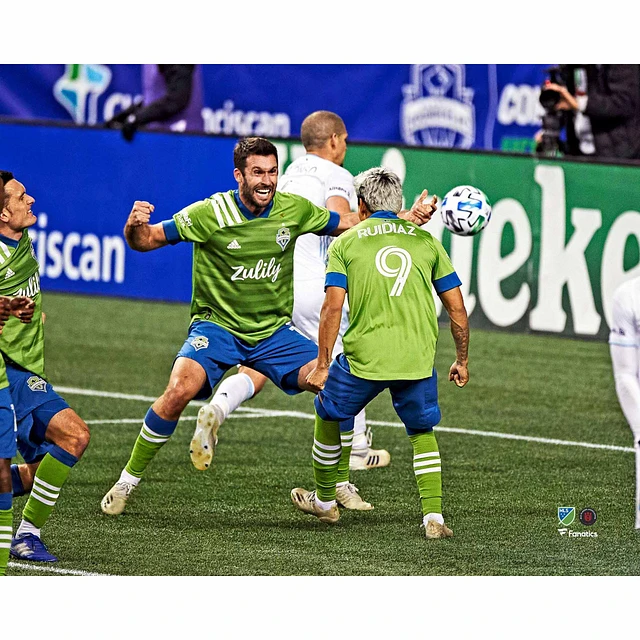 Raul Ruidiaz Seattle Sounders FC Unsigned 2020 MLS Cup Western Conference Finals Champions Goal Celebration with Will Bruin Photograph
