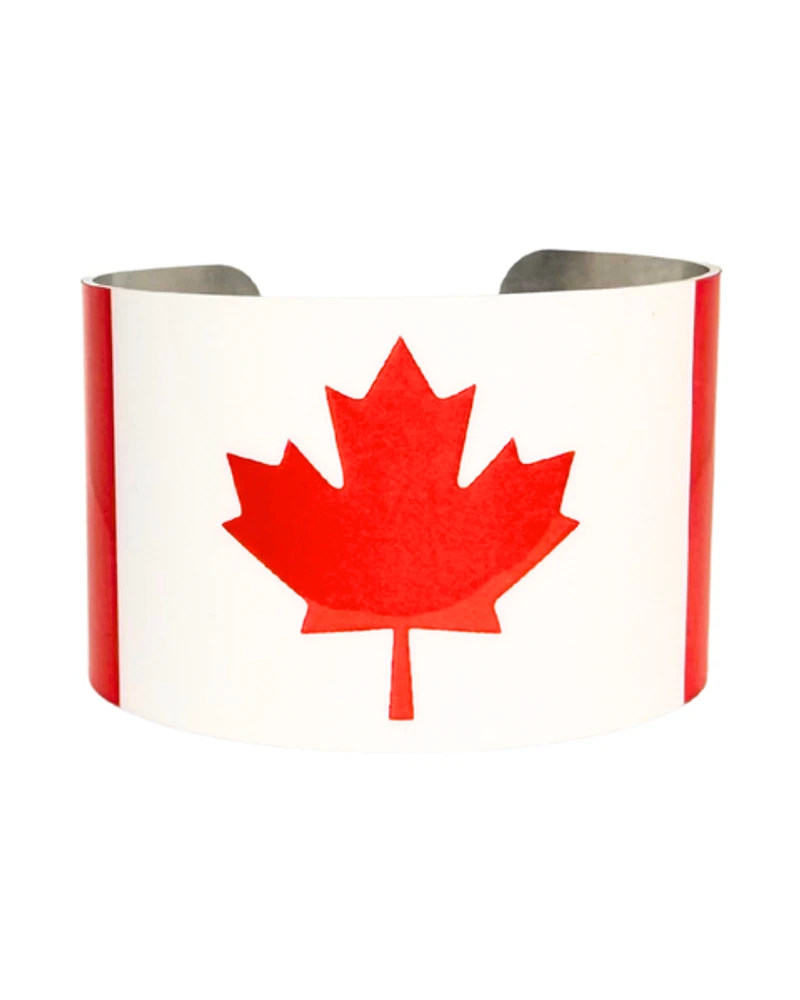 Handcrafted in Ontario Featuring a vibrant Canada flag, this wide cuff is printed with permanent dye for long-lasting color and impact. Inside is marked with "true north strong & free". Made from lightweight, hypoallergenic aluminum that’s nickel-free and non-toxic. Slightly bendable for a custom fit.