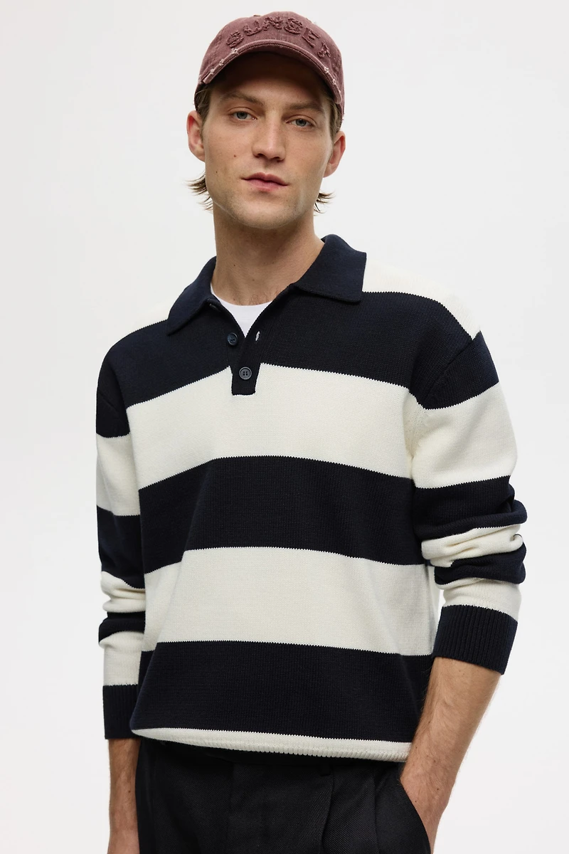 Relaxed-fit polo shirt in soft, fine-knit cotton with a casual but not oversized silhouette. Collar, short button placket, and long sleeves. Wide ribbing at cuffs and hem.