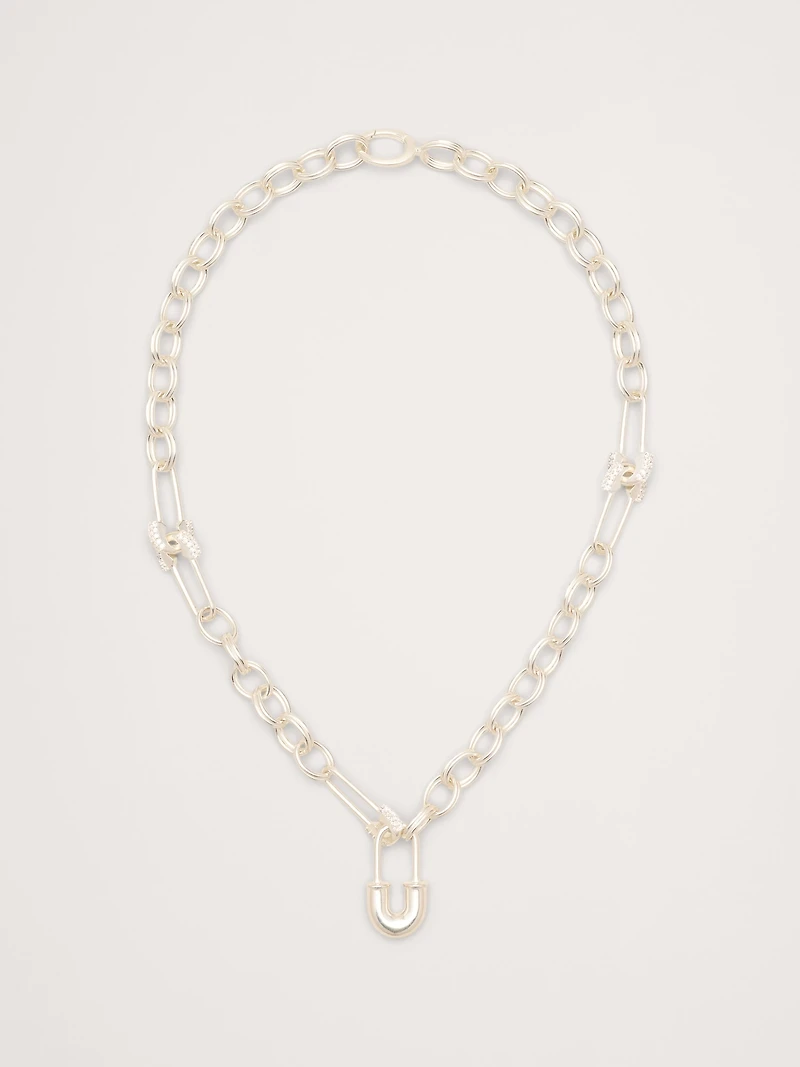 Classic chain-link necklace reimagined with rhinestone-accented, safety-pin links. Finished in either 14k-gold or 999-silver plated brass. 14k-gold or 999-silver plated brass. Ring clasp.