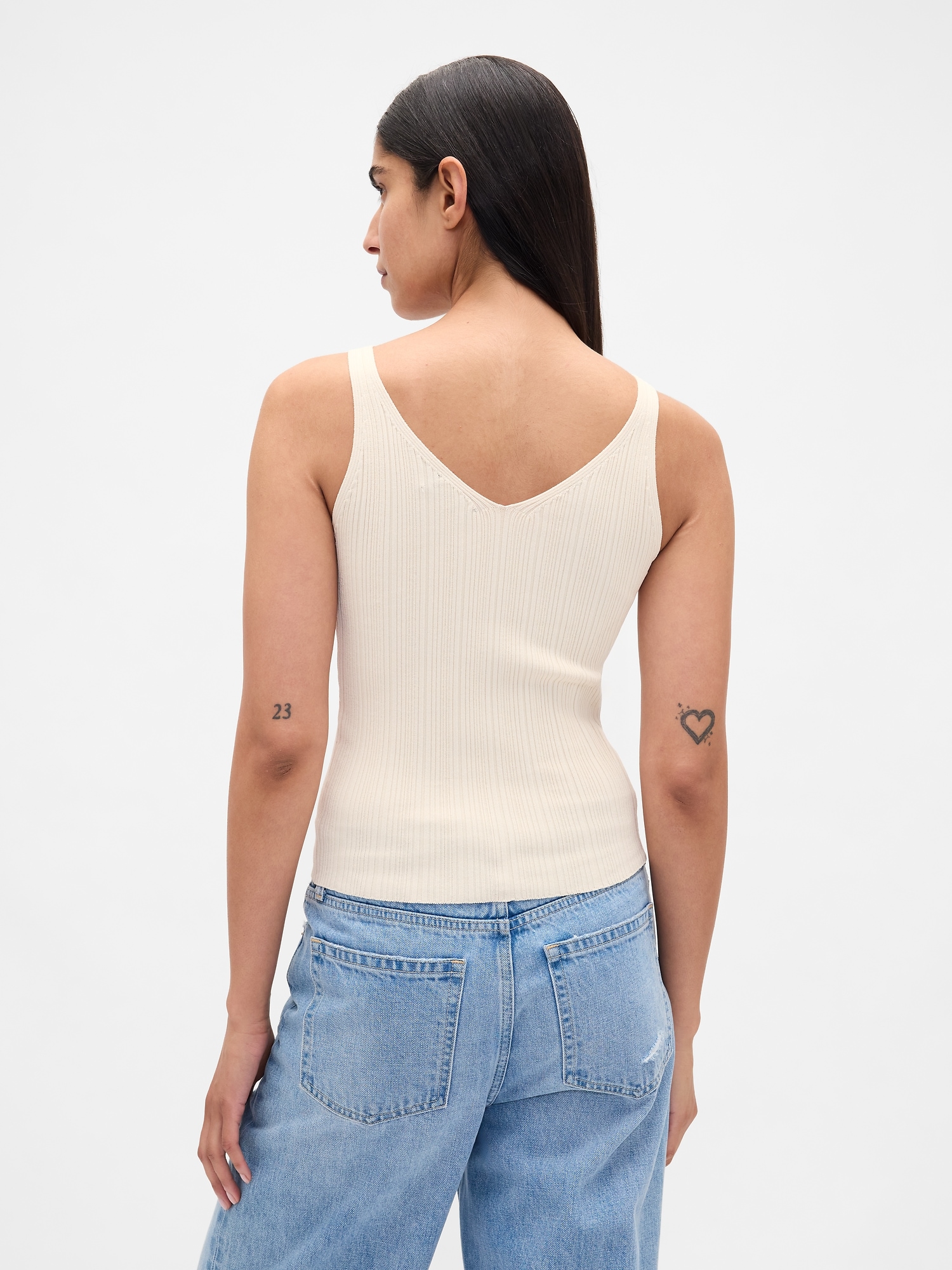 Soft, luxe ribbed sweater knit tank top. V-neck. Tank straps. Sleeveless. This product was made in a factory that invests in gender equity and women’s empowerment through RISE. Learn more at gapinc. com/equity.