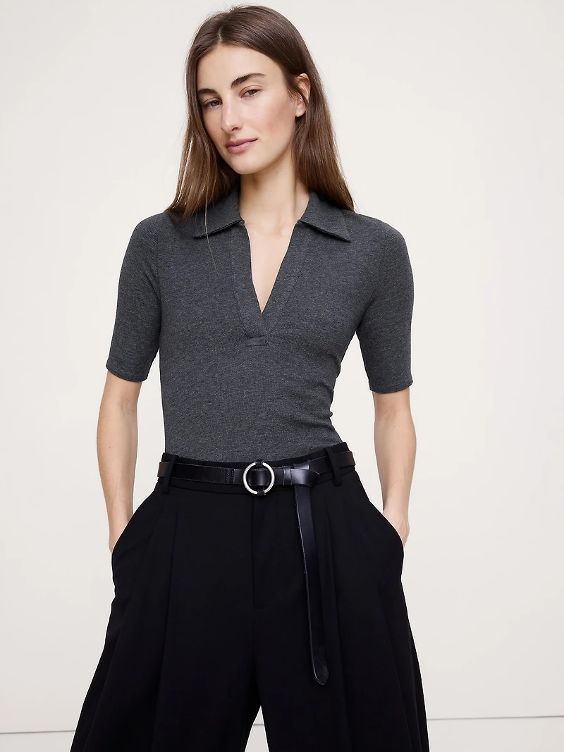 Meet the effortless polo we'll be reaching for all year. We love the soft, ribbed fabric, the button-free polo collar and the body-conscious fit. Stretches to fit. Johnny collar (no buttons). Straight hem.