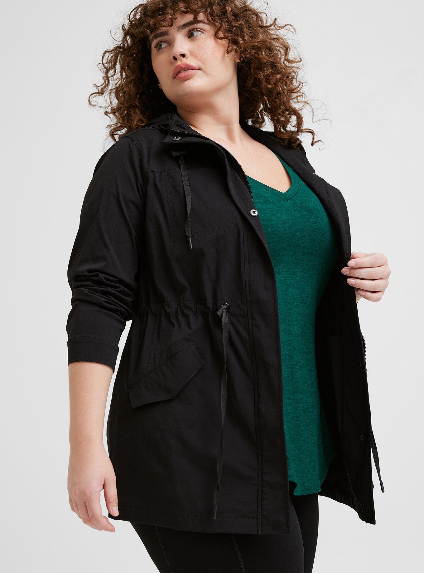 FIT Measures 33'' from shoulder (size 2). MATERIALS + CARE Active ripstop woven fabric. 95% nylon, 5% spandex. Machine wash cold. Tumble dry low. Imported. DETAILS Hooded neckline. Long sleeves. Inner adjustable waist drawcord. Snap button sleeve closure. Functional chest & side pockets.
