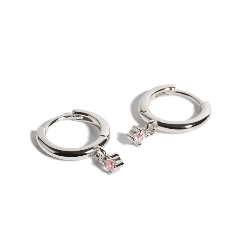 The Rosie earrings are small hoops adorned with a pink zircon charm. This piece is made of vermeil gold, crafted from 925 sterling silver, and plated with 14k white gold.