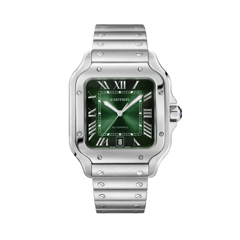 Santos de Cartier watch, large model, mechanical movement with automatic winding 1847 MC. Steel case, 7-sided crown set with a synthetic faceted blue spinel, graduated green dial, polished steel sword-shaped hands with luminescent material, sapphire crystal. Steel bracelet with SmartLink adjustment system. Second strap in green alligator skin, with interchangeable steel folding buckle. Both are fitted with the QuickSwitch interchangeable system. Case width: 39.8 mm, thickness: 9.38 mm. Water-resistant up to 10 bar (approx. 100 meters/330 feet).