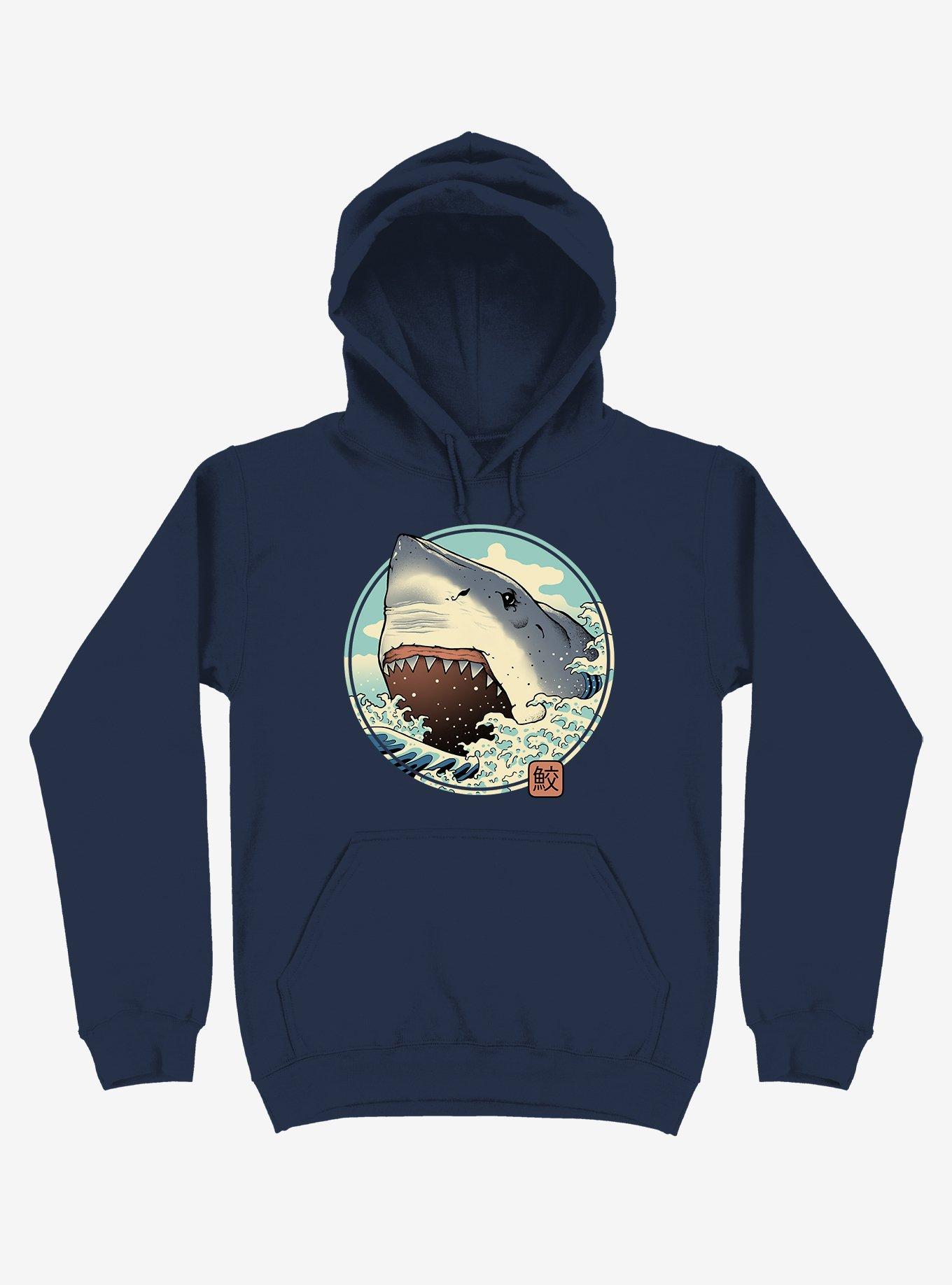 Where else can you find a sweatshirt inspired by traditional Japanese woodblock prints of the Edo period and... sharks?! Thought so. This navy blue pullover hoodie showcases a shark attack like no other. Officially licensed art from Vincent Trinidad.