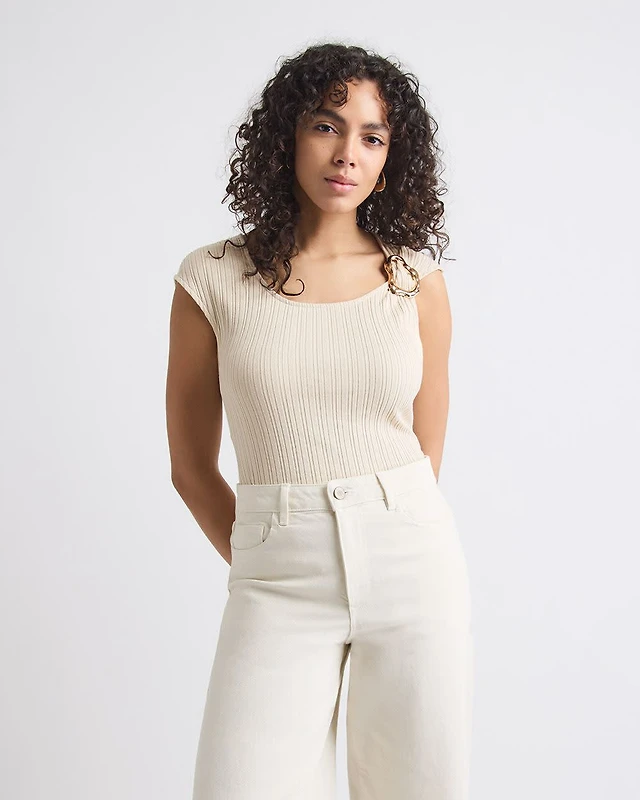 Fitted Double-Layer Elbow-Sleeve Scoop-Neck Top