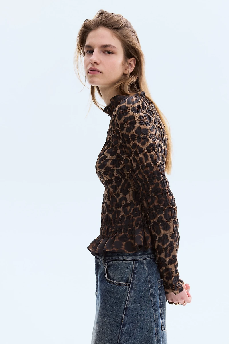 Short, fitted top in a smocked, woven viscose blend with ruffle trim. Boat neck and long sleeves.