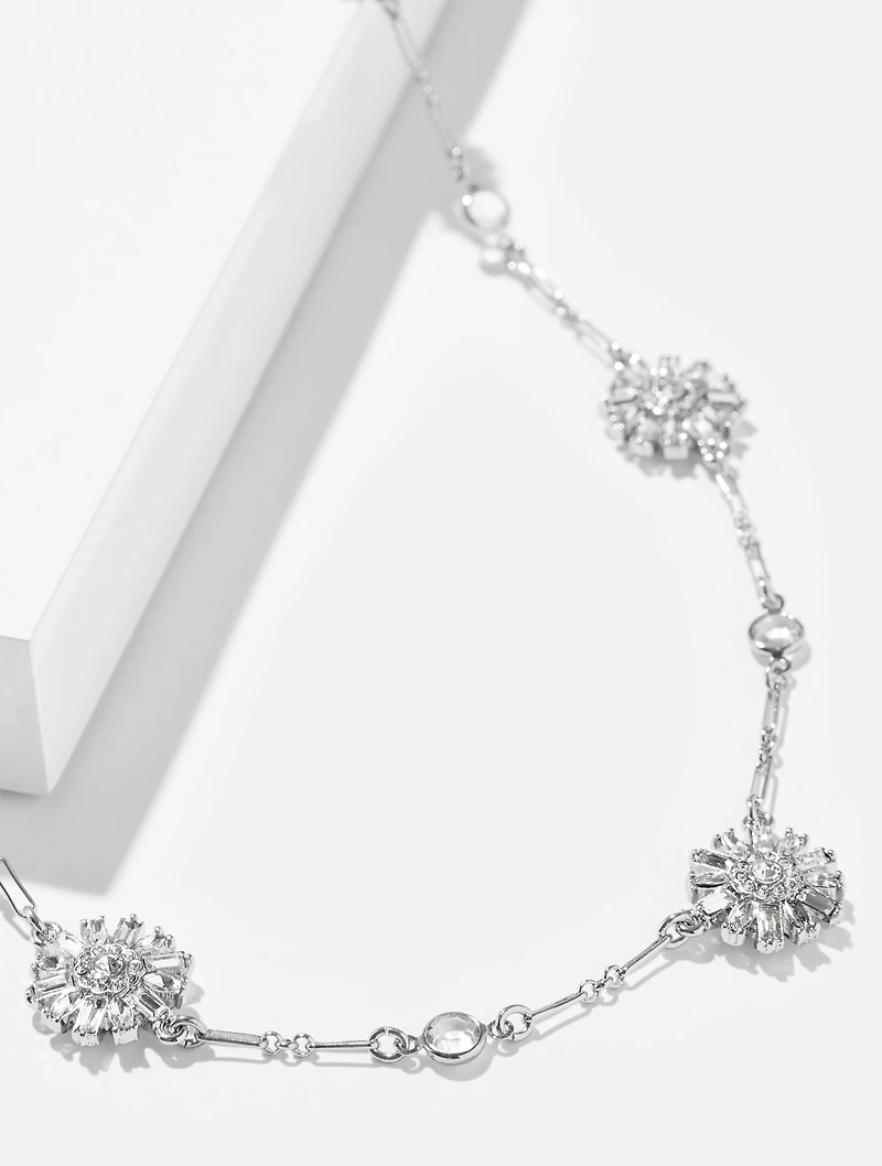 Let it snow…and sparkle! Tiny snowflakes add elegant sparkle to this elongated statement necklace. It's the perfect finishing touch.